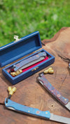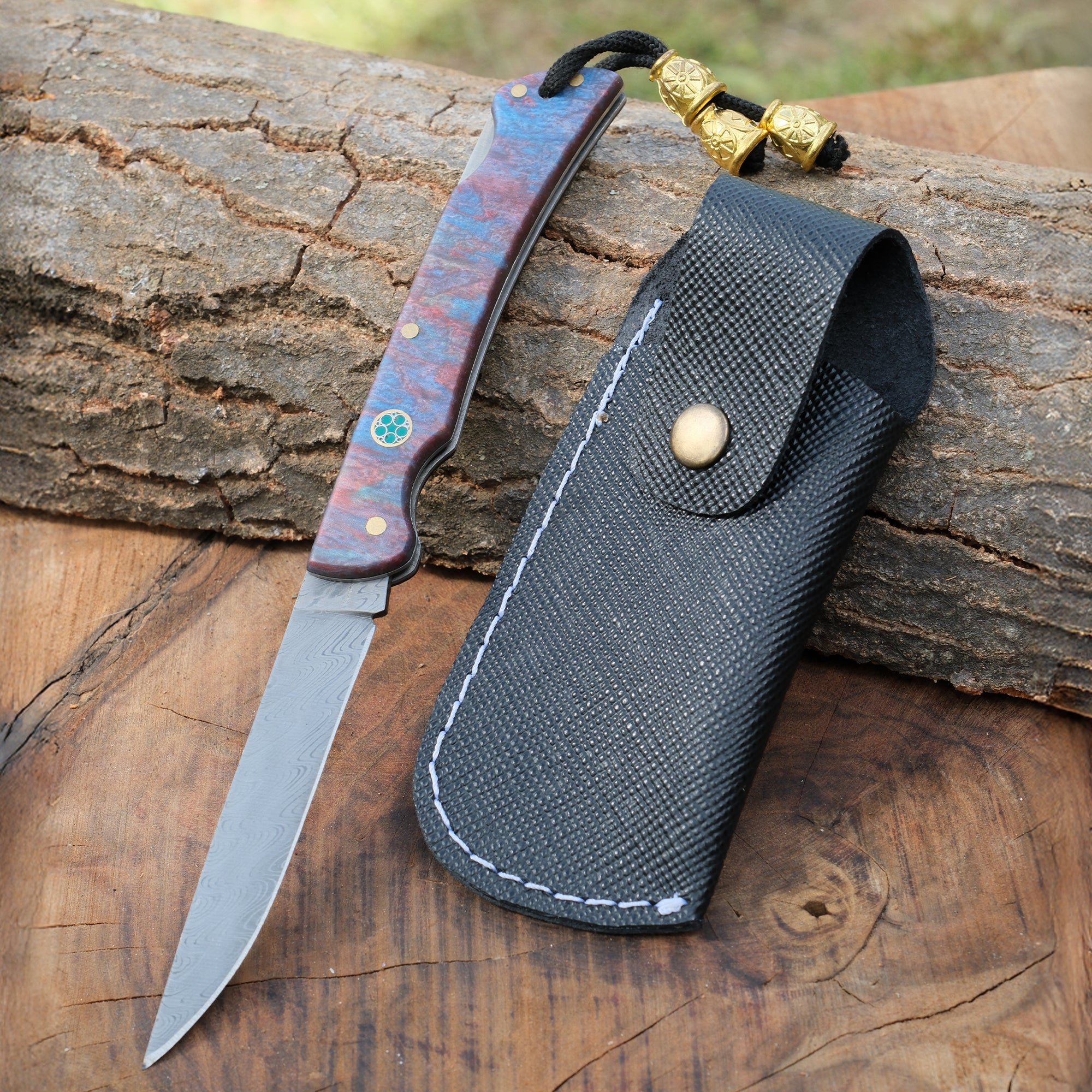 Damascus çeliğin benzersiz damarlı yapısı ve yüksek keskinlik performansı ile dikkat çeken bu katlanır model, hafif ve kompakt tasarımıyla günlük taşıma için idealdir. Stabilize sap, uzun ömürlü kullanım ve şık görünüm sağlarken, hediye deri kılıfı ile güvenle saklanabilir.
