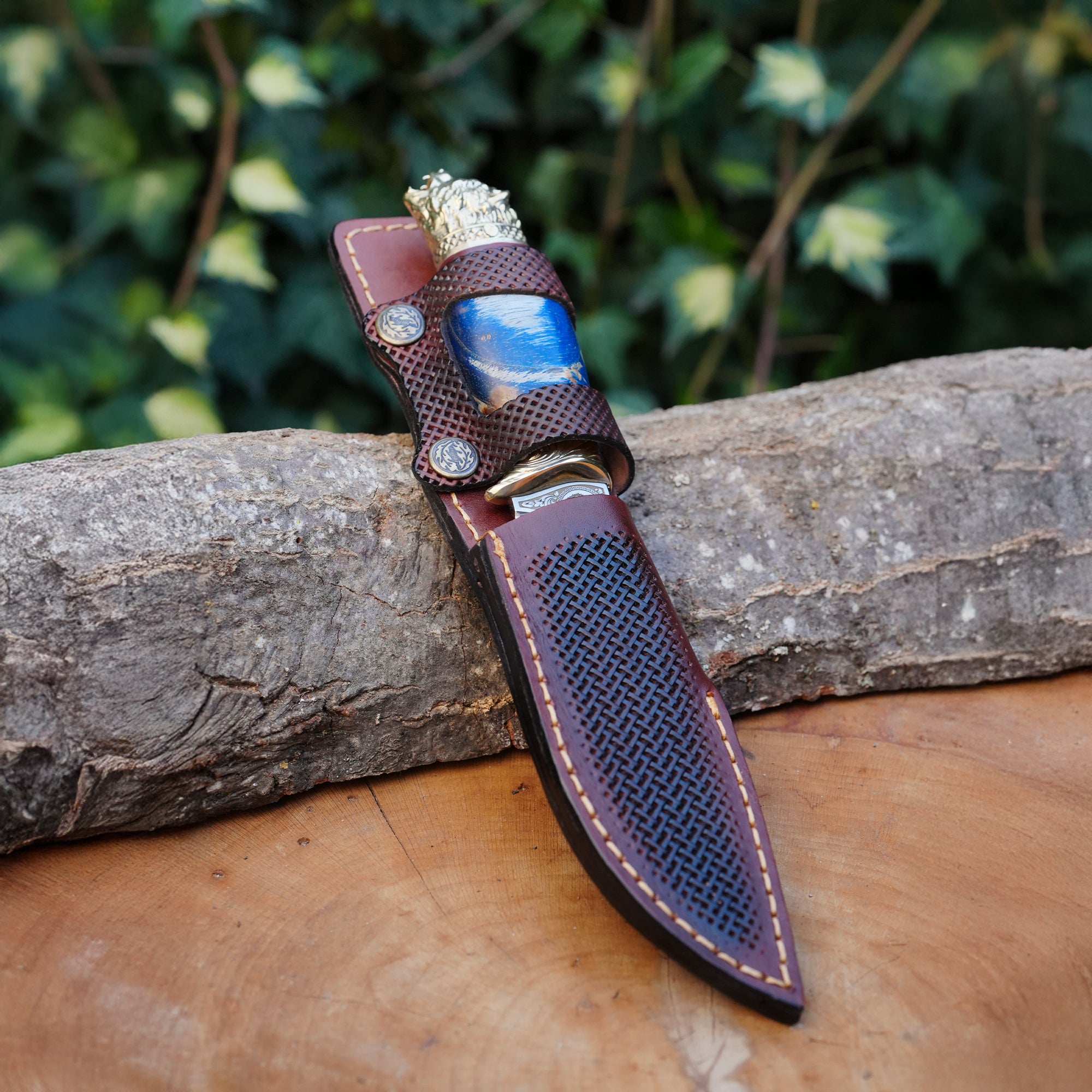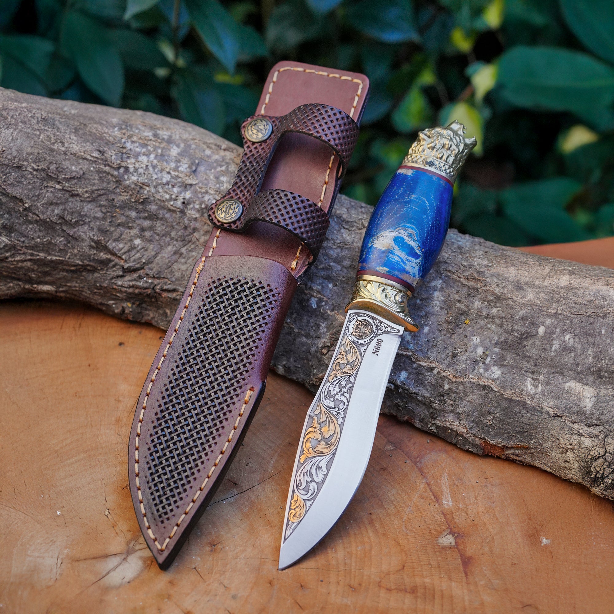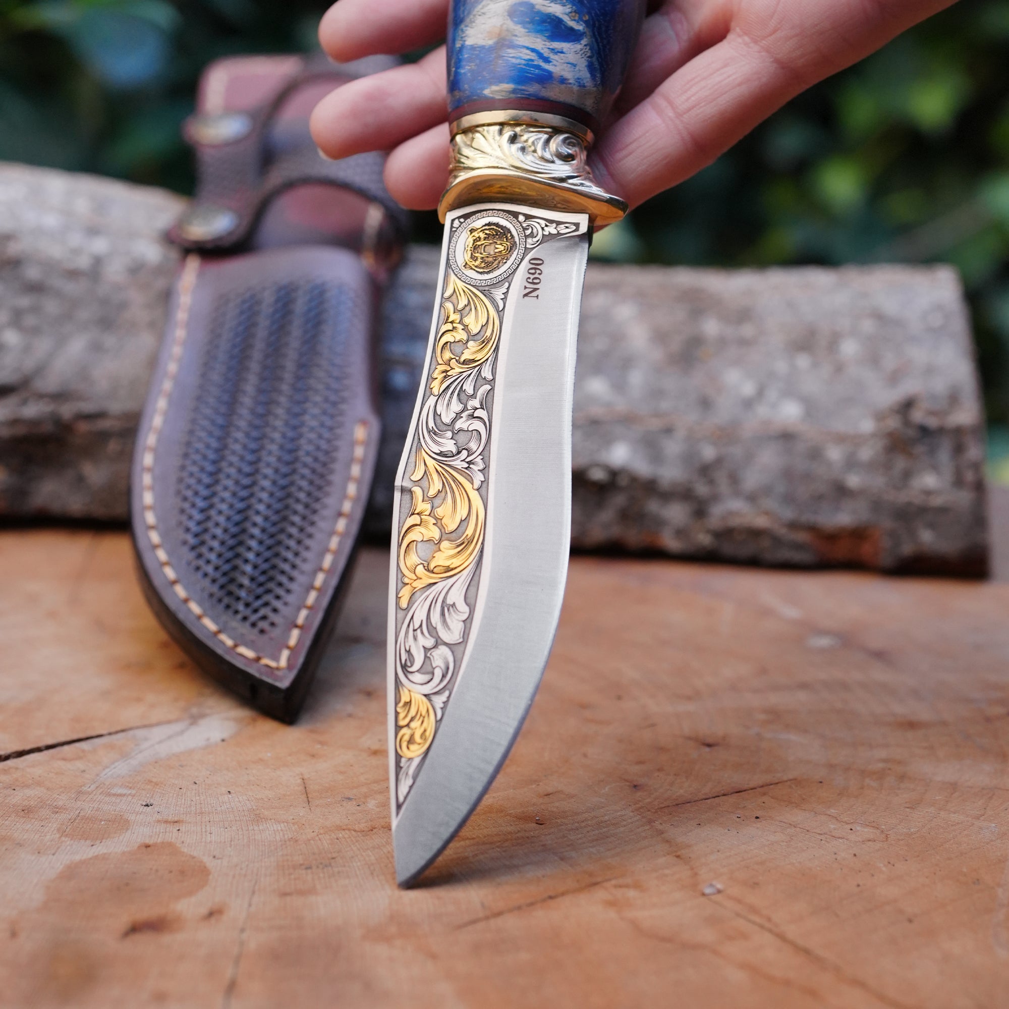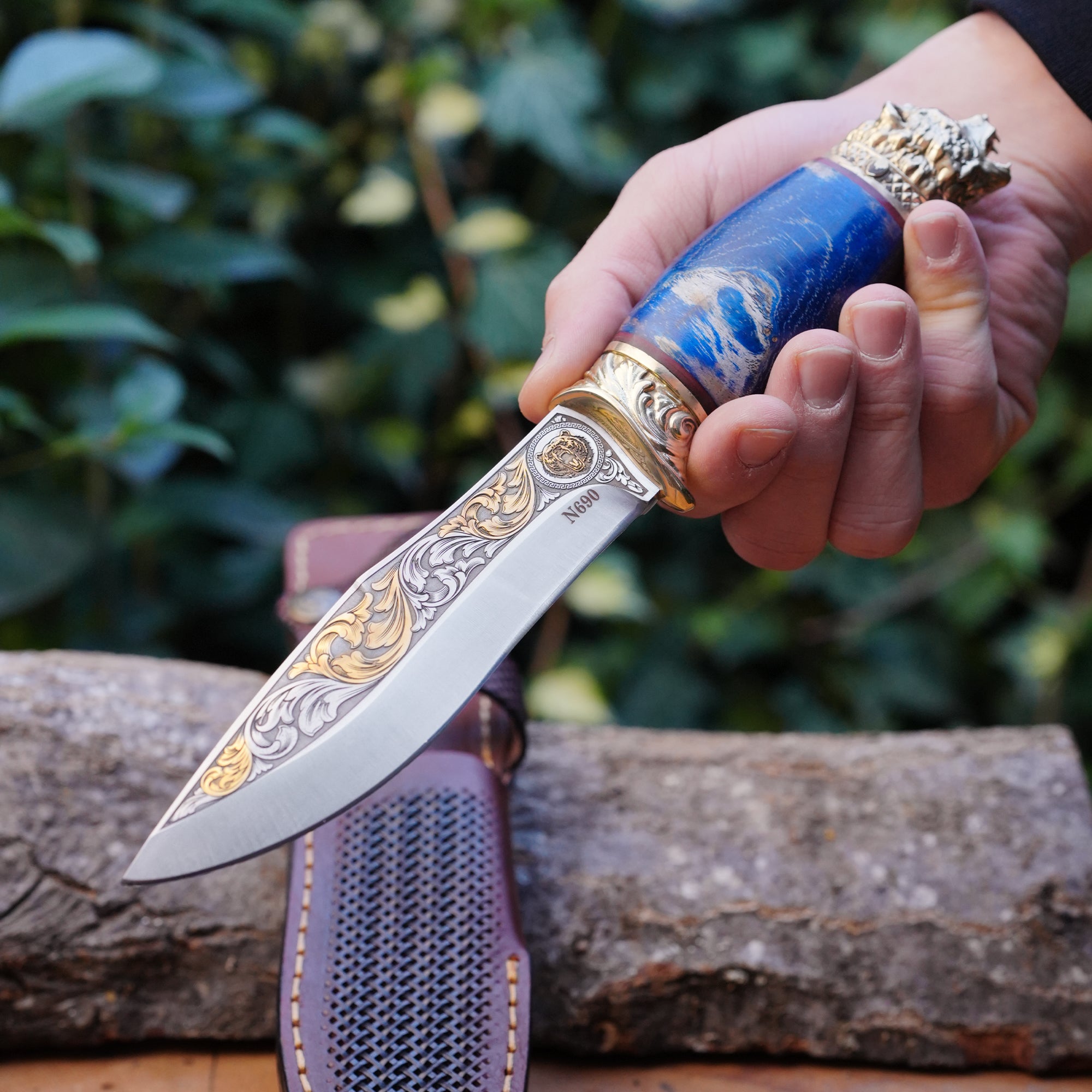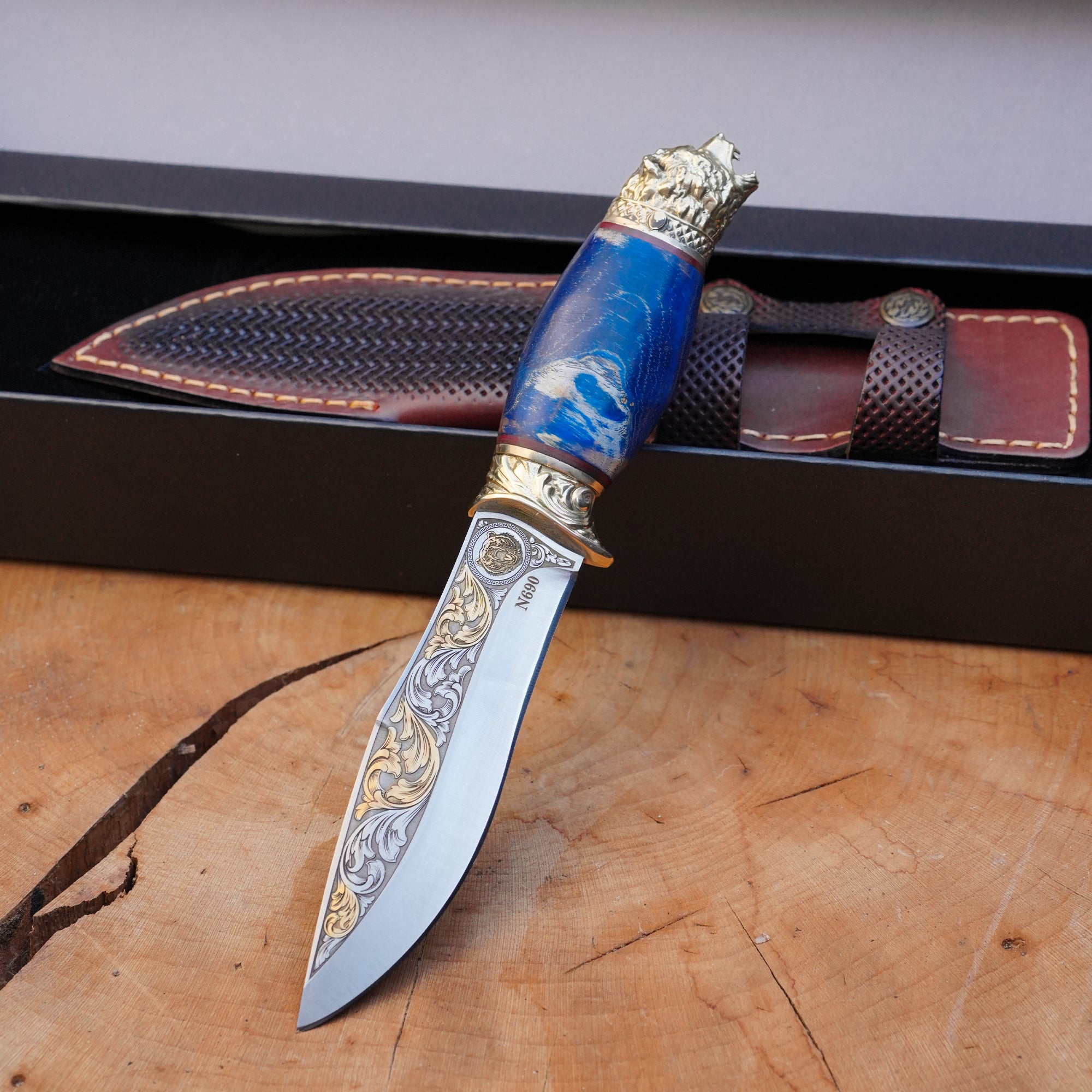 Koleksiyonluk ve Hediyelik Puukko Bıçak 24K Altın Kaplama Ayı Başlı Gravür İşlemeli