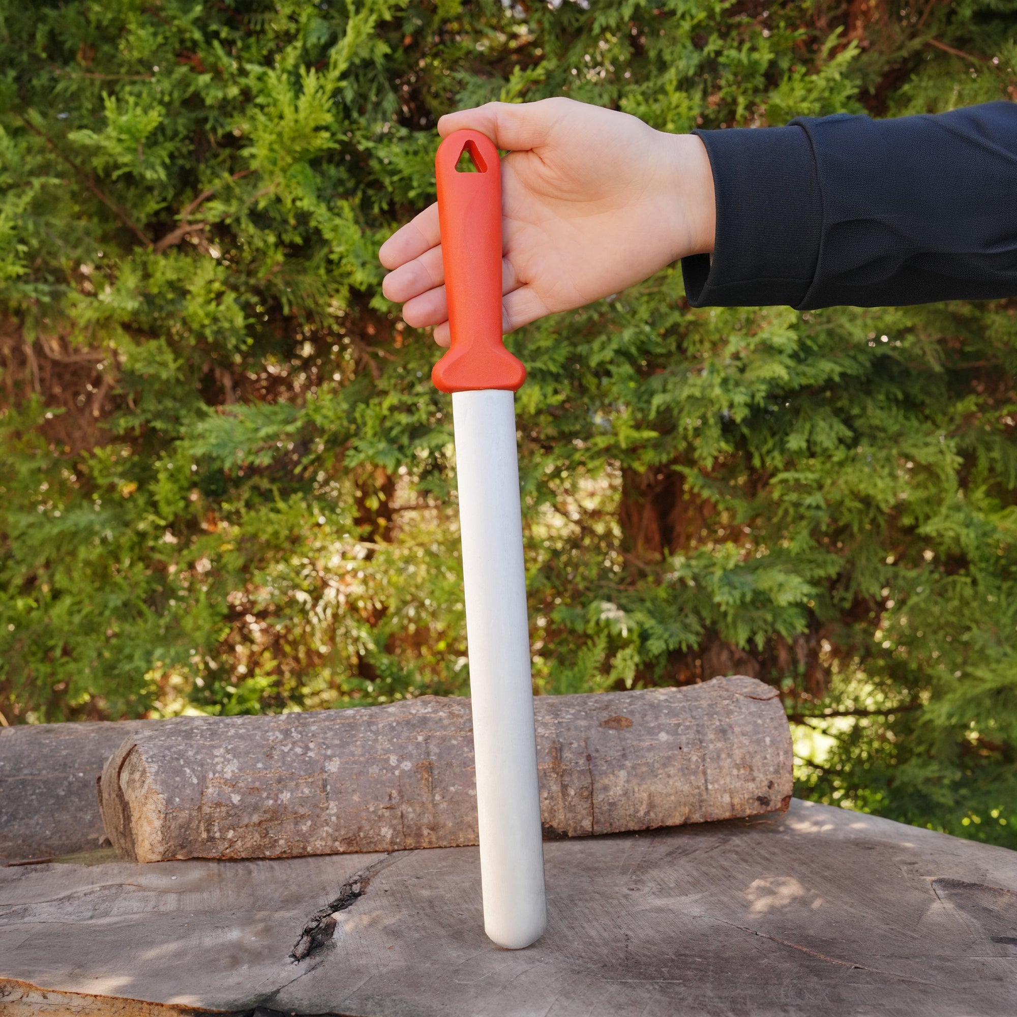 Mutfakta keskinliği korumak isteyenler için ideal olan bu masat, paslanmaz çelik gövdesiyle uzun ömürlü kullanım sağlar. Kompakt kabzanın doğal dokusu, hem estetik hem de sağlam bir tutuş sunar. Profesyonel mutfaklardan ev kullanımına kadar her ortamda güvenle kullanılabilir.